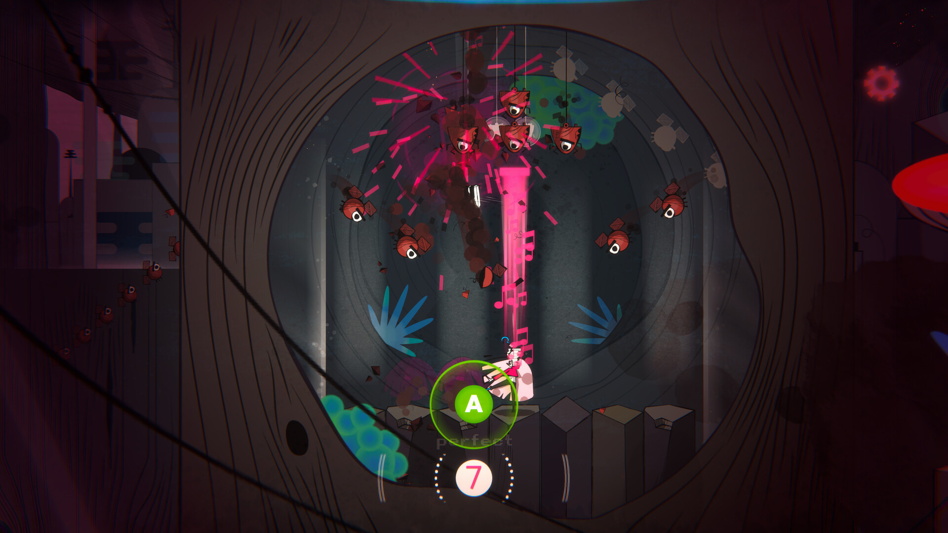 An explosive musical show set in a hand-drawn retro-futuristic universe. From shoot’em up to rhythm game, take on the role of three punk musicians, confronting a mad queen and her planet-killing machine. Discover a surprising gameplay blending arcade, music and comics!