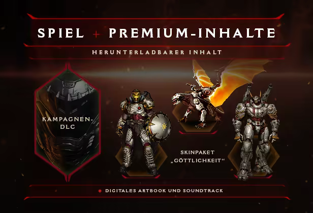 Kämpfe standhaft in der Premiumversion inklusive Kampagnen-DLC*, dem digitalem Artbook und dem Soundtrack sowie dem Skinpaket „Göttlichkeit“, das passende Skins für den DOOM-Slayer, den Drachen und den Atlan enthält.