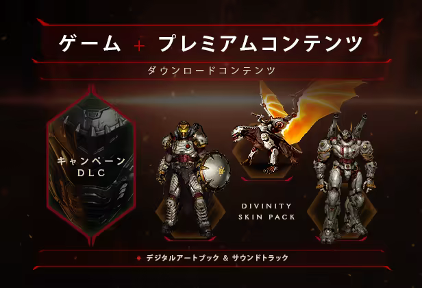 『Premium Edition』で、いち早くデーモンとの戦いを始めよう。最大2日間のアーリーアクセス*、キャンペーンDLC*のほか、「Digital Artbook and Soundtrack」、ドゥームスレイヤー、ドラゴン、アトランのスキンが含まれる「Divinity Skin Pack」が収録されています。