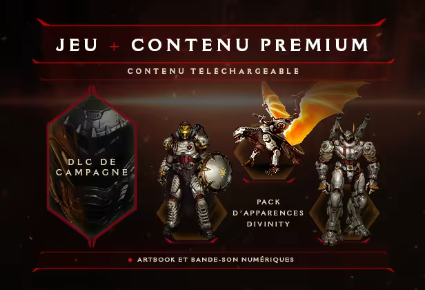L’heure du combat est arrivée avec l’Édition Premium, comprenant le DLC de campagne*, l’artbook et la bande-son numériques ainsi que le pack d’apparences Divinity, qui comprend des apparences assorties pour le DOOM Slayer, le dragon et l’Atlan.