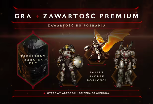 Stań do walki z edycją premium obejmującą dodatek fabularny*, cyfrowy artbook i ścieżkę dźwiękową oraz pakiet skórek boskości zawierający skórki z tym samym motywem dla DOOM Slayera, smoka i atlana.