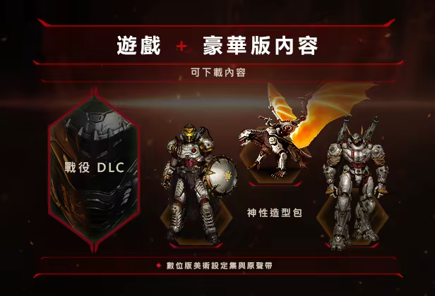 浴血開戰,購買豪華版,其中包括戰役 DLC*、數位版美術設定集、原聲帶和神性造型包,內含毀滅戰士、巨龍和亞特蘭機甲的專用造型。
