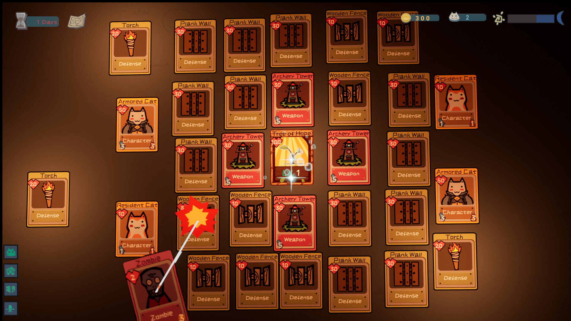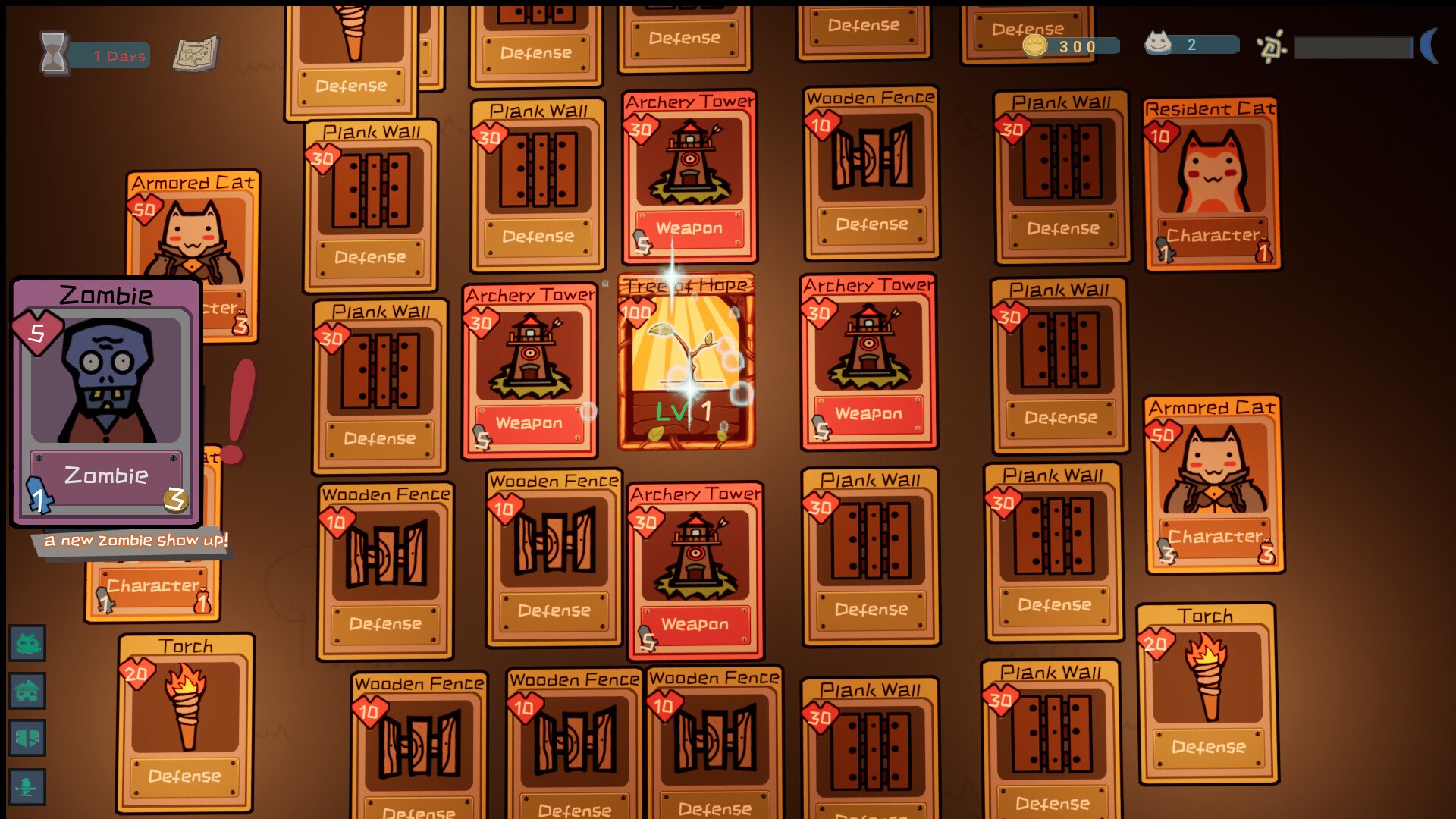 Once you have enough resources, you can build various battle cards in the shop to defend the Tree of Hope. We have cat-building cards that can train cats with different abilities, functional building cards that improve the quality of cat life and increase wealth accumulation, defensive cards that can block and delay zombies, and weapon cards that deal various types of damage to zombies. Which battle cards to prioritize depends on your strategy.