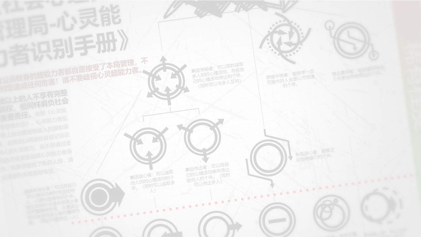 The Social Mental Health Administration handles all affairs related to psychics in the city. All psychics must be managed by the Social Mental Health Administration and have a management device implanted in their cervical spine. Registered psychics must obtain approval from the Administration to use their psychic abilities. For particularly serious crimes and crimes that may involve psychics, the Psychic Inspection Department of the Social Mental Health Administration has the right and obligation to participate in the investigation.