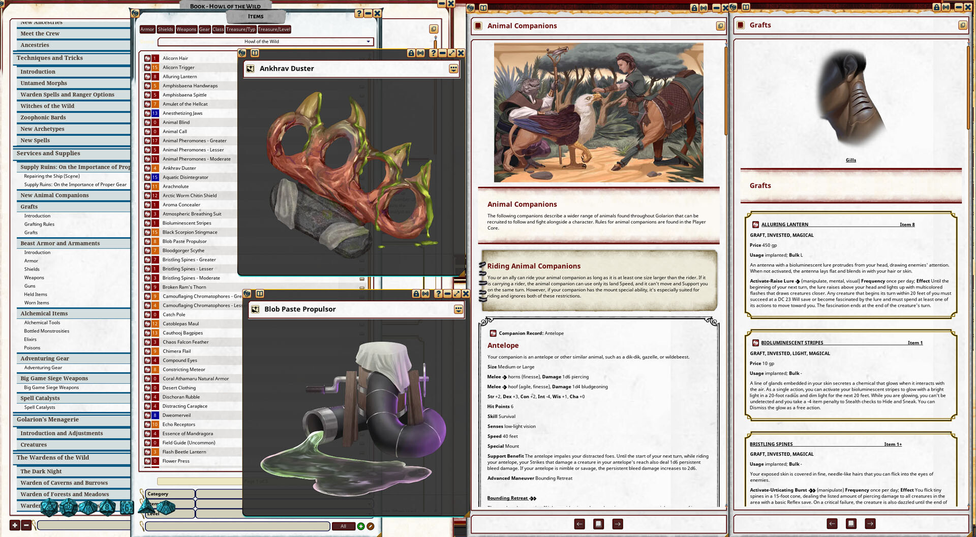 • A menagerie of Golarion's animals and beasts for GMs to unleash on players, covering animals like dinosaurs and sharks, expansions on classic monsters like chimeras and griffons, and never-before-seen creatures like the transparent sky fisher, the potion-brewing apothecary bee, and the extradimensional rift chameleon.