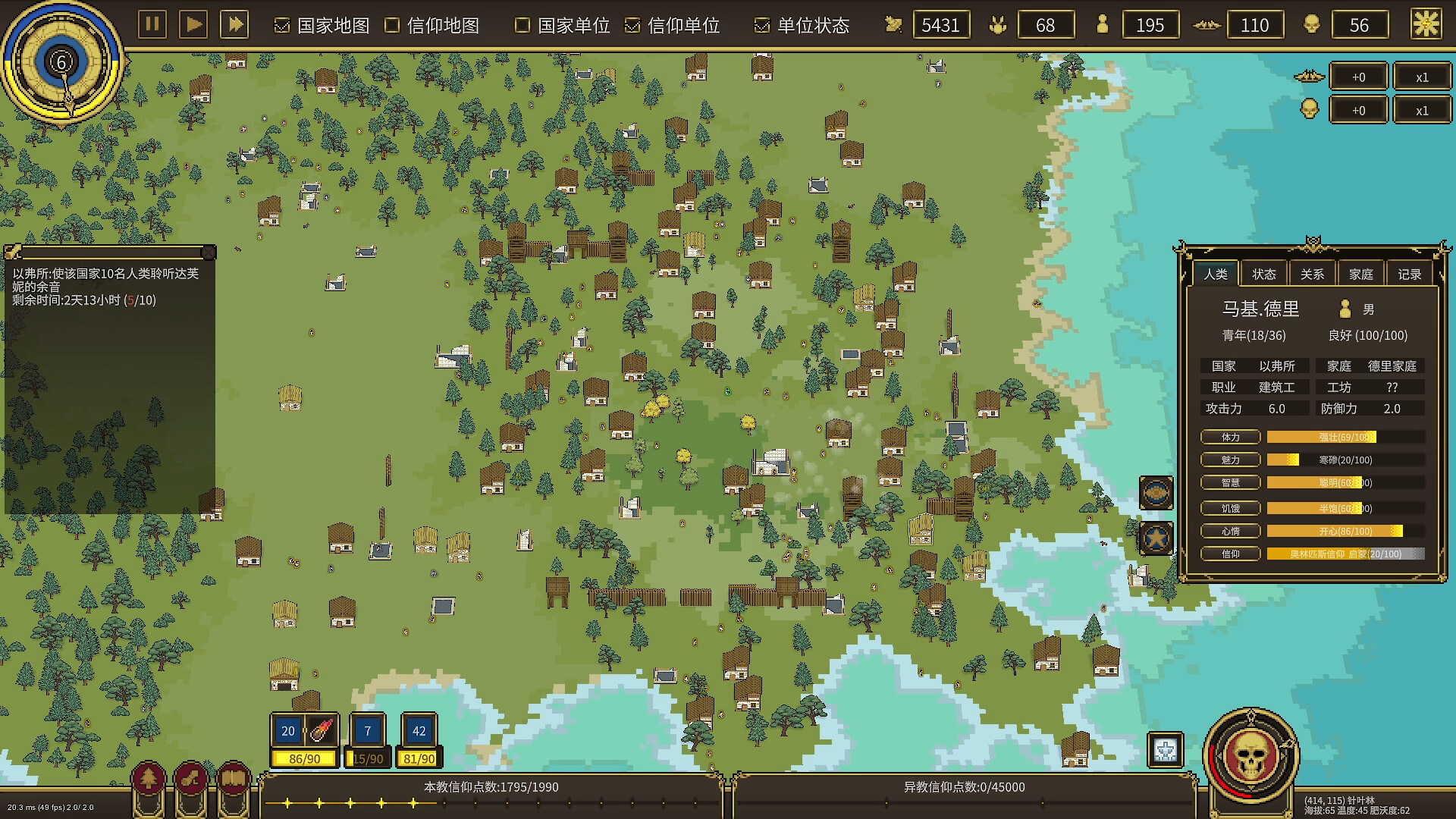 In this randomly generated sandbox, every human is a unique individual with their own name and traits. You can play as a passive observer, watching them work and grow naturally, or actively intervene. Use divine powers to create resources, boost the population, or grant technological revelations, guiding your people from scattered settlements into fortified city-states.
