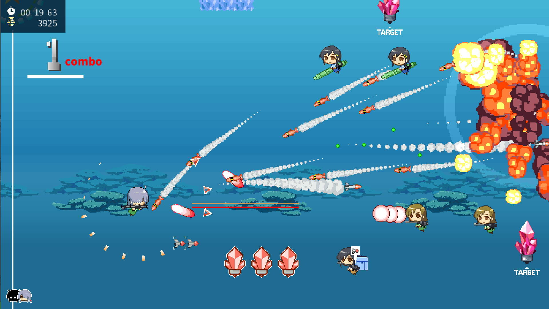 Carve the path to victory with kamikaze attacks! Blow away enemies with outlandish weapons, then become your own projectile and take the rest out in a blaze of explosive glory! A self destructive shmup where you devastate everything in your wake. "Squadron, charge~!"