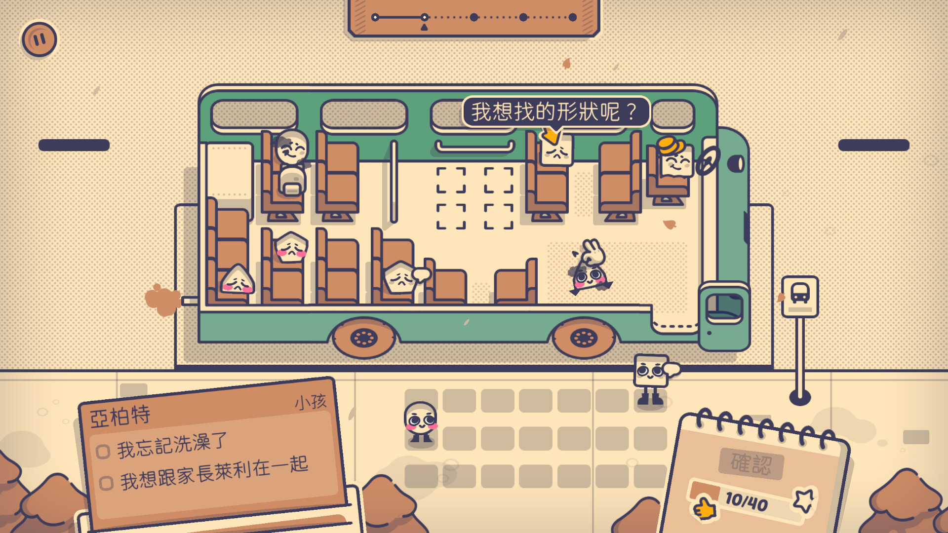 電影院、擁擠公車、婚宴、窄小計程車,每個場景都會引入具有特定偏好的新角色。聚會上有些客人鼻子很靈,不願意坐在噴了太多古龍水的陌生人旁邊。公車上有些乘客想小睡片刻,不希望旁邊有人大聲播放音樂。仔細觀察現場的所有角色,設法安排最合適的位子!