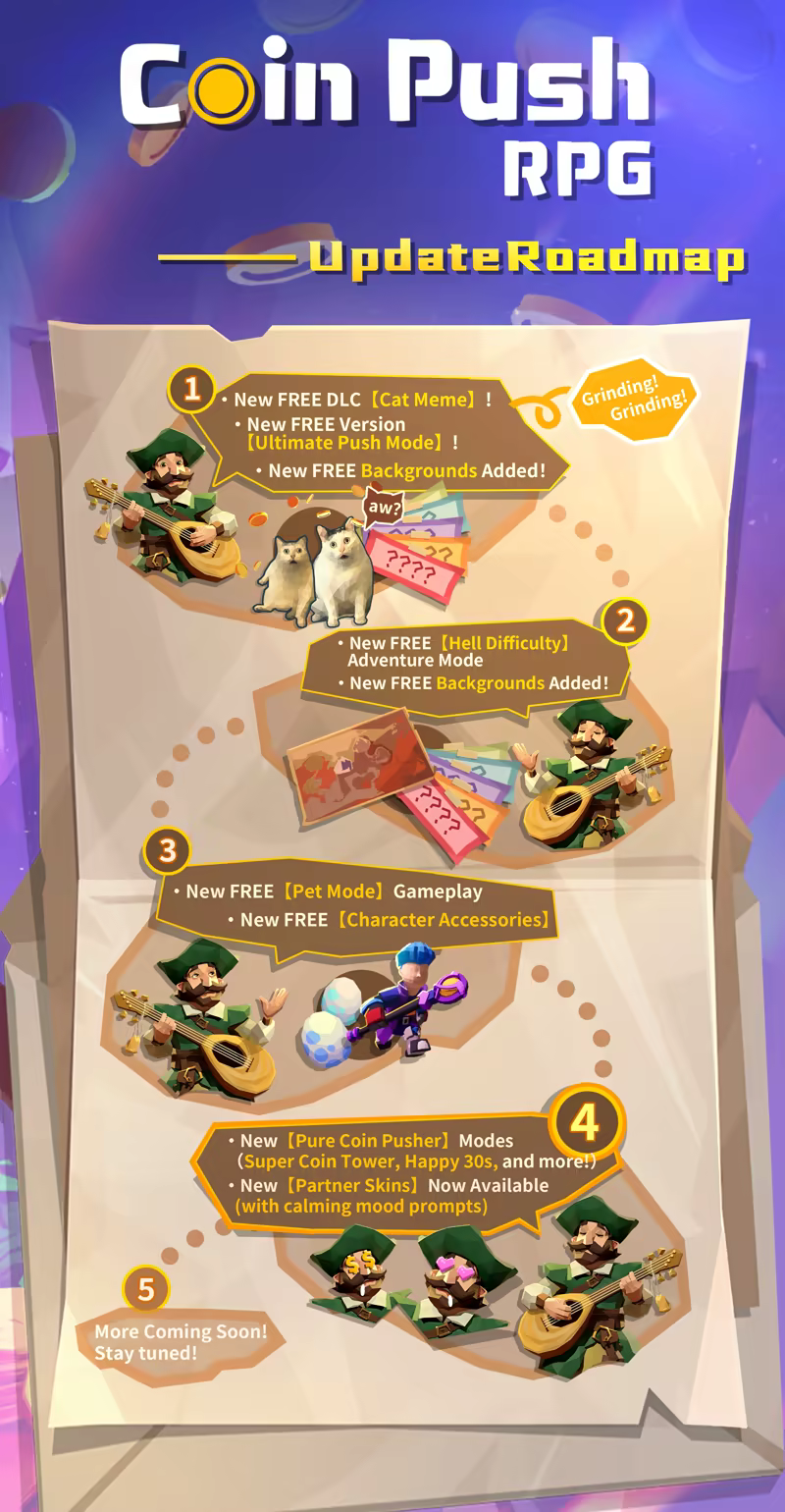Coin Push RPG is a unique blend of Semi-Idle RPG and coin-pusher gameplay! Recruit legendary heroes, equip them with powerful gear, upgrade your town, construct buildings, and unlock stunning backgrounds as you expand your influence. Build a diverse and unstoppable team with your own unique style .