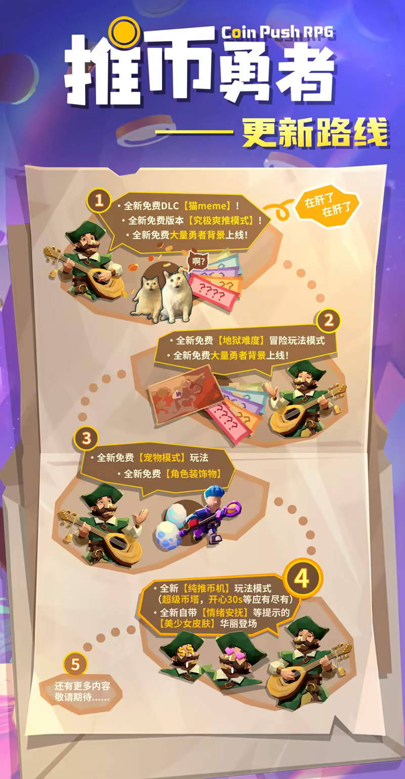 《推币勇者》是一款融合了推币机玩法的RPG半放置类游戏,除了丰富的角色、物品、装备外,您还可以自由招募勇者,升级城镇,BD构筑,为他们配置天赋、解锁背景,不断扩大势力,打造风格各异的强大战队!欢迎加入qq群:954251687