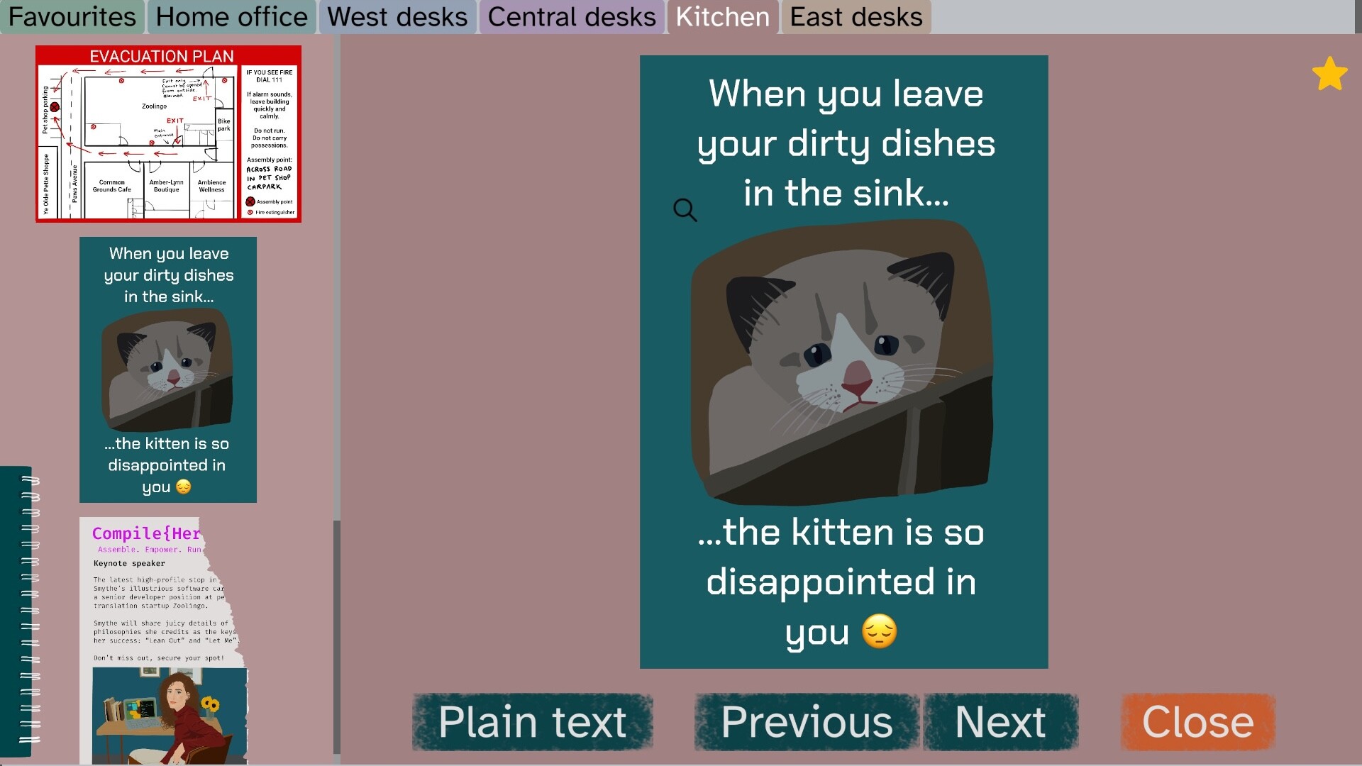 Zoolingo is a seemingly thriving startup which is building a pet translation app. After landing a massive round of investor funding, its CEO has vanished. Only a few documents have escaped the shredder. Your job is to meticulously read through every piece of paper.