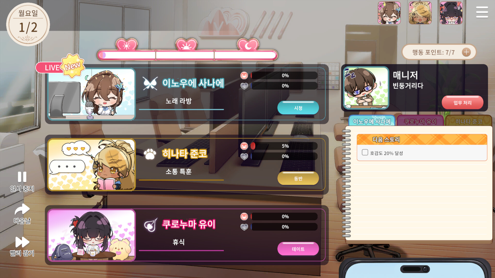 세 명의 VTuber를 동시에 키워야 하는 당신, 행동 포인트를 적절하게 분배하고 어떤 여자 주인공의 성장을 지켜볼지 선택해야 합니다.