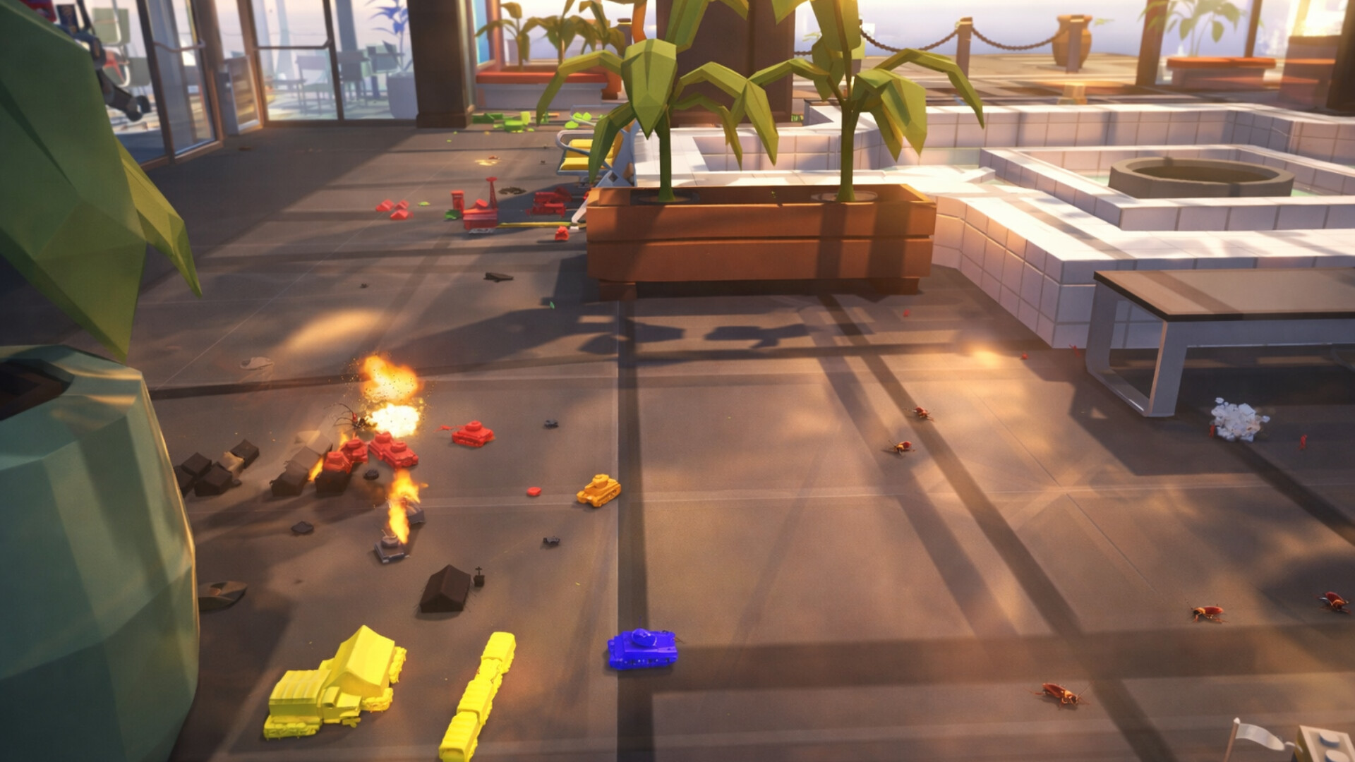 Fight across living rooms, bedrooms, gardens, forests, and more where everyday objects become towering terrain. Sandboxes, fountains, the base of a tree, rocks that look like mountains, and stuffed animals that feel like giant monuments all become part of the battlefield.