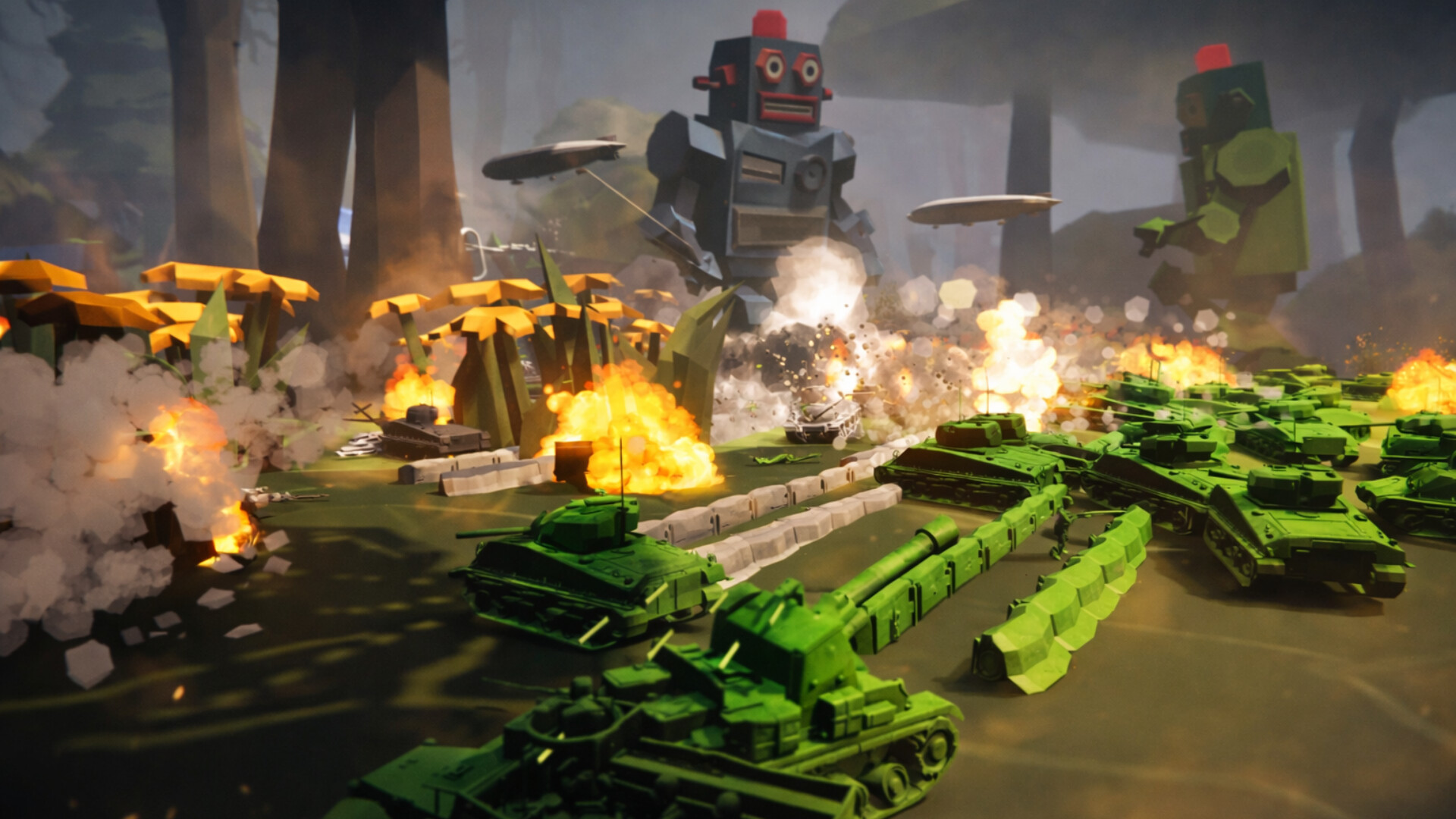 Command toy soldiers across massive battlefields where everyday objects become warzones. Build your base, expand your army, and fight for control against rival factions and dangerous wildlife. Switch between full RTS or direct control of any unit, from infantry on the ground to aircraft in the sky.