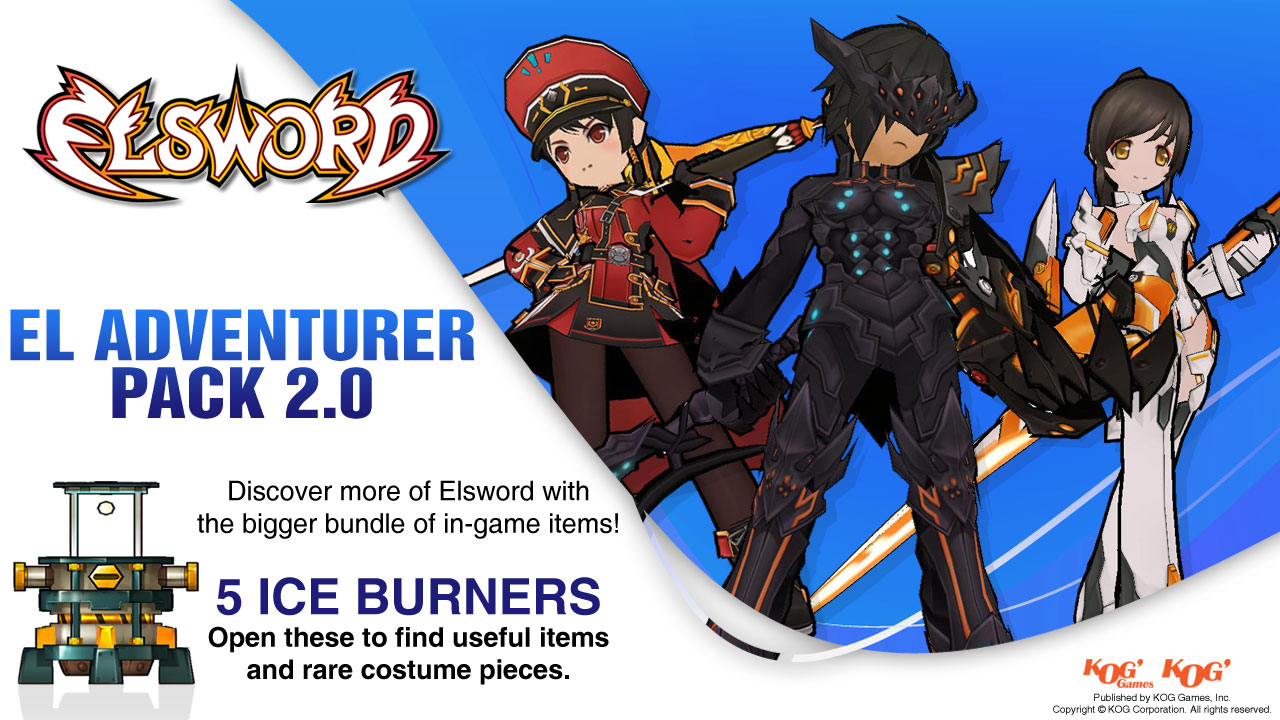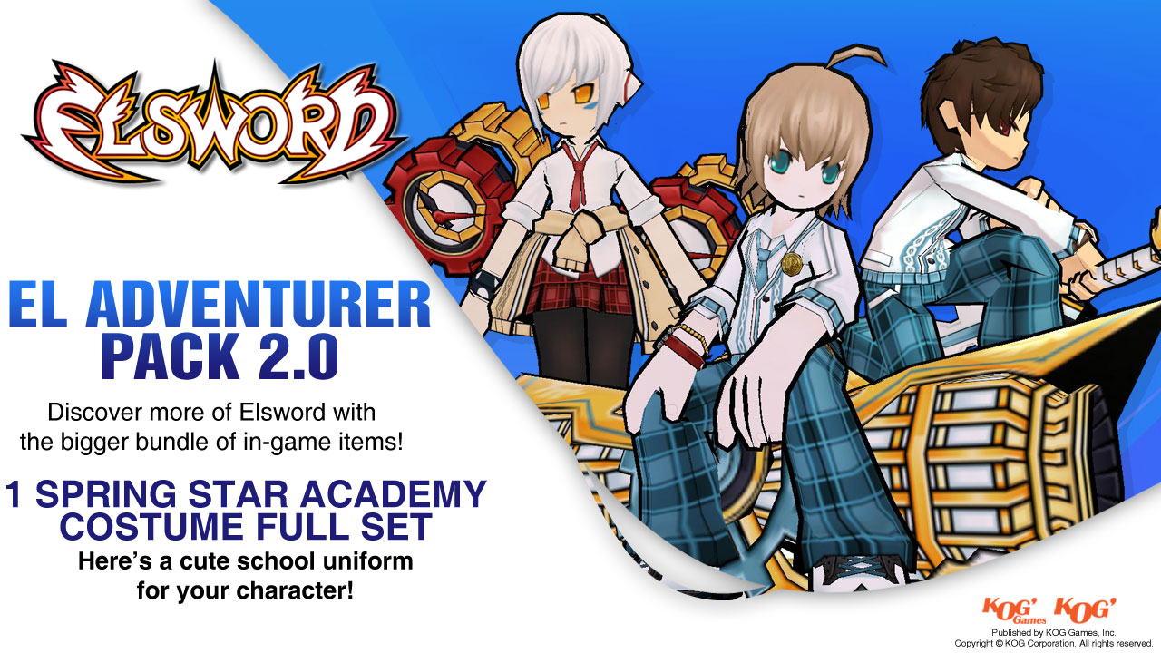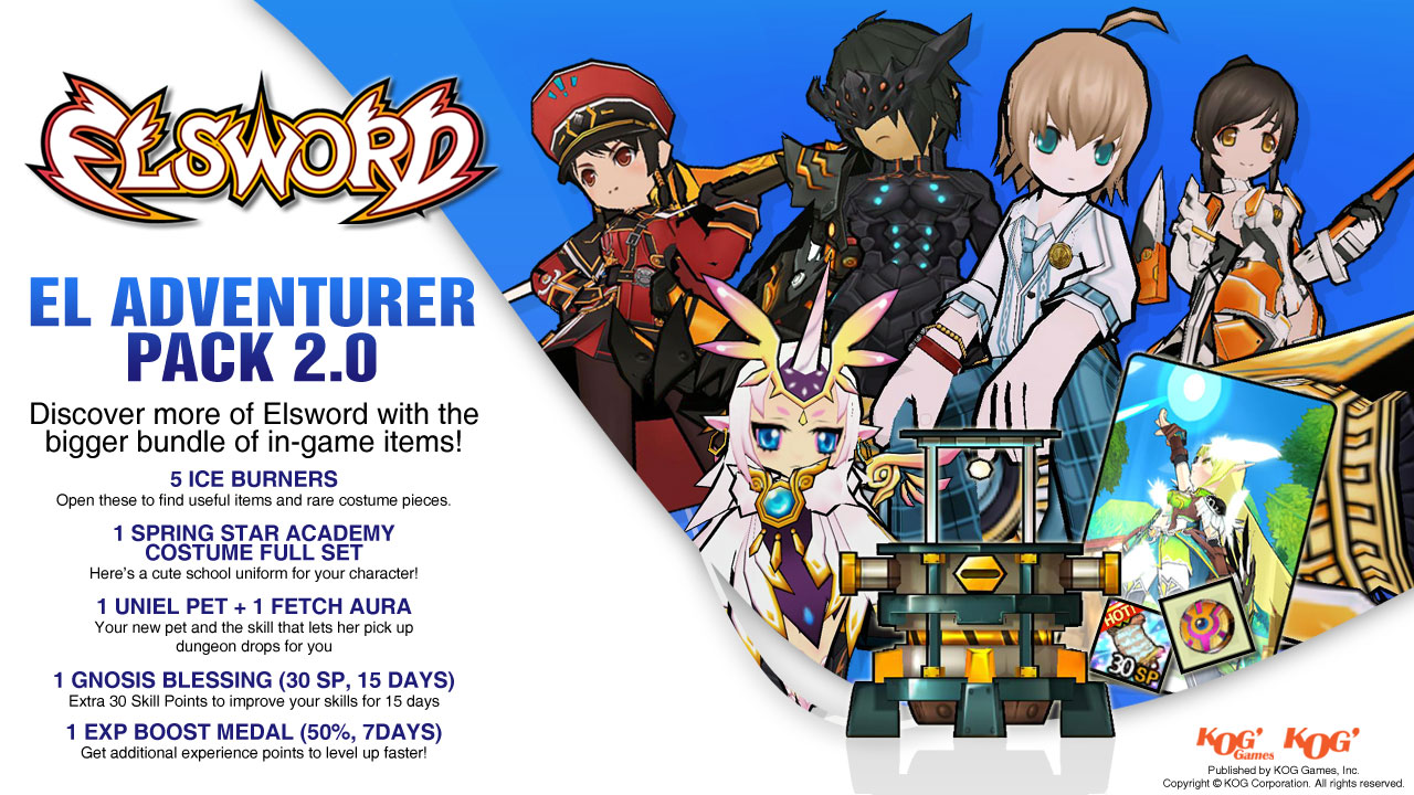 Discover more of Elsword with the bigger bundle of in-game items! With the El Adventurer Pack, nothing can hold you back. Contains 5x Ice Burners, 1x 1 Spring Star Academy Costume Full Set, 1x Uniel Pet, 1x Fetch Aura, 1x Gnosis Blessing (30SP, 15 days), and 1x EXP Boost Medal (50%, 7 days).