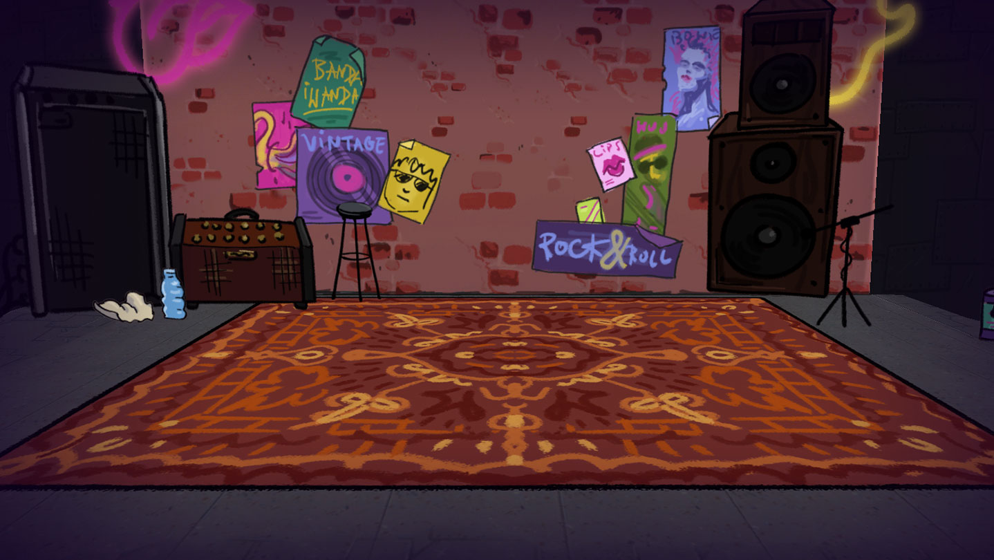 You start in The Venue, your favorite spot to hang out and watch bands! The bands playing are all other players' creations. Your ratings will affect how often that band is booked for shows in everyone else's games. When you start making a song, you'll be given a random instrument and bandmate, and you'll record a 10 second track.