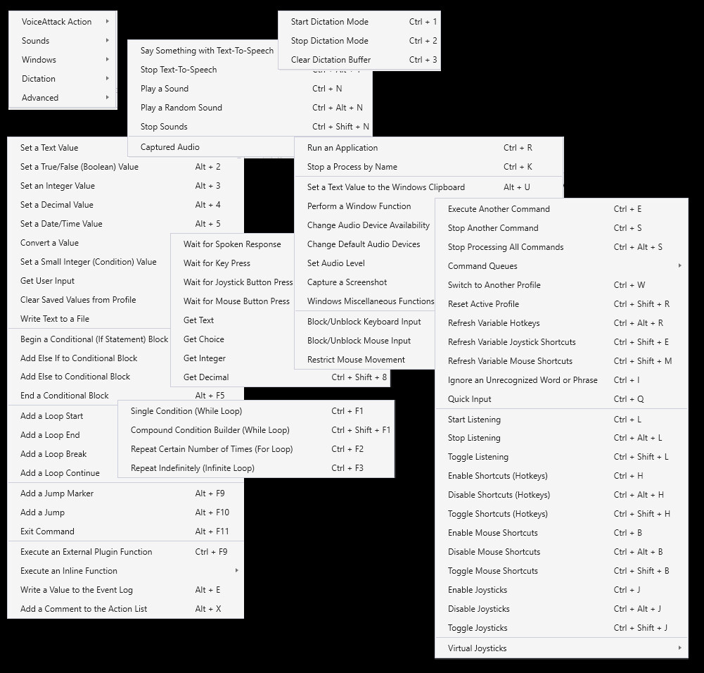 Loops, control statements, variables, tokens and even a plugin interface. You can even write, compile and share your very own functions using C# or VB .net code within VoiceAttack. It's all there to help you design sophisticated commands to help make your life easier, or your opponents' lives more difficult.