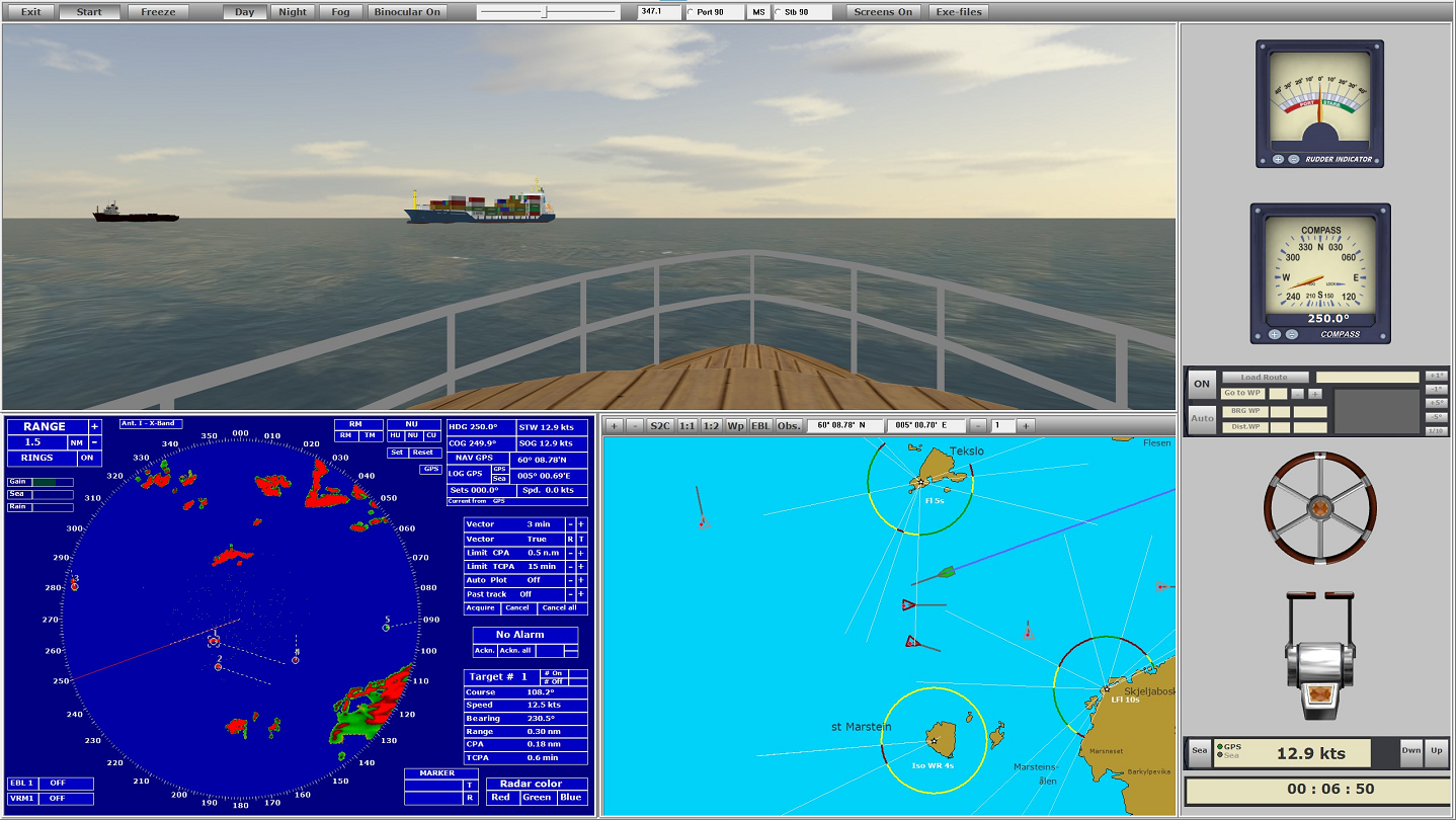 The program is a simplified navigation simulator modeled after that used in maritime schools. With separate windows for Radar, Map, Steering Console and view from the wheelhouse. You can choose to use 1, 2 or 3 screens. The main emphasis is on Radar and ARPA, but you can sail visually and navigate by beacons, buoys and stakes. One can choose whether it should be day, night or fog. At night one sees light from beacons and buoys with characteristics which corresponds to what is shown on the map for the area in which one is sailing. As you can see, this is a good aid to practice and gain experience with using radar and ARPA.