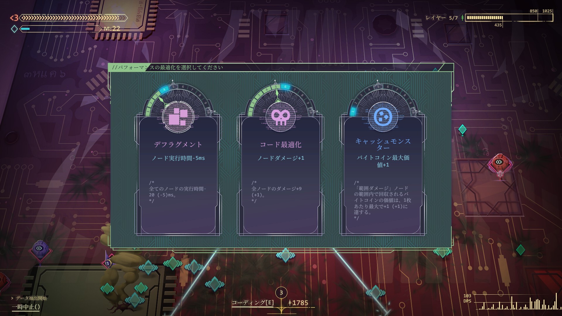 ネオンが輝く仮想空間で、様々なデジタル生命体が襲いかかる。たとえ20分の短時間プレイでも、数時間のやり込みプレイでも、ハイスピードなトップダウンバトルが爽快感とスリルをもたらす!戦場の状況を素早く分析し、リアルタイムでコード戦略を調整!わずかな最適化が、敵の怒涛の攻撃の中で生き残るか否かを左右する!