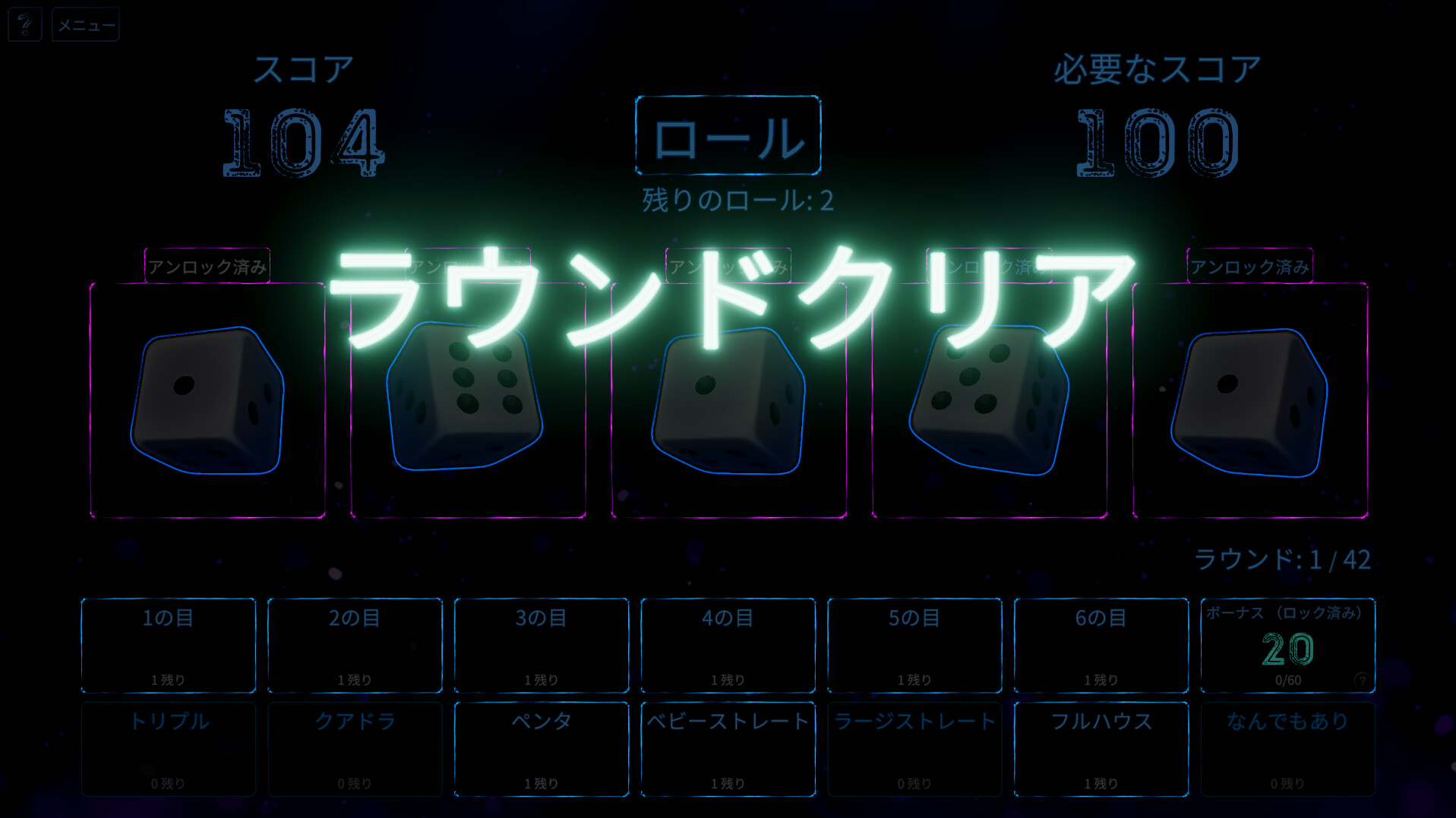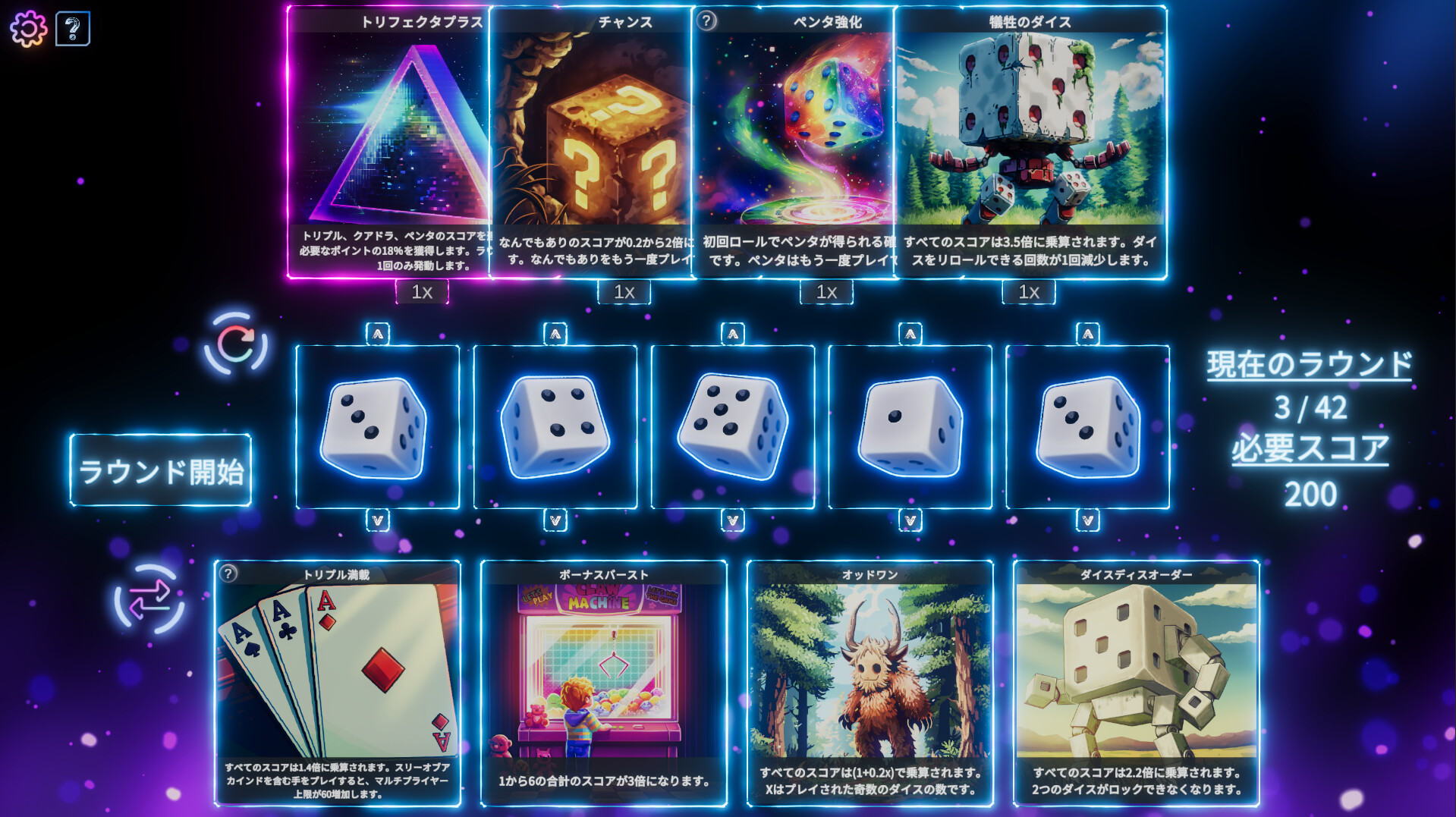 ダイスを振って得点を獲得し、アーティファクトを選んでゲームプレイを強化しながら、可能な限り高いラウンドを目指します。各ラウンドでは、設定されたポイント数を達成する必要があり、進むにつれて難易度が上がります。必要なポイントを満たせないとゲームオーバーとなり、最初から再挑戦となります。