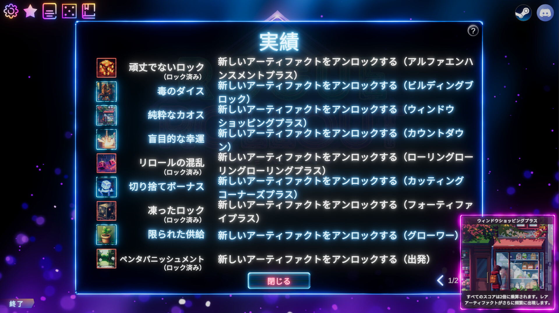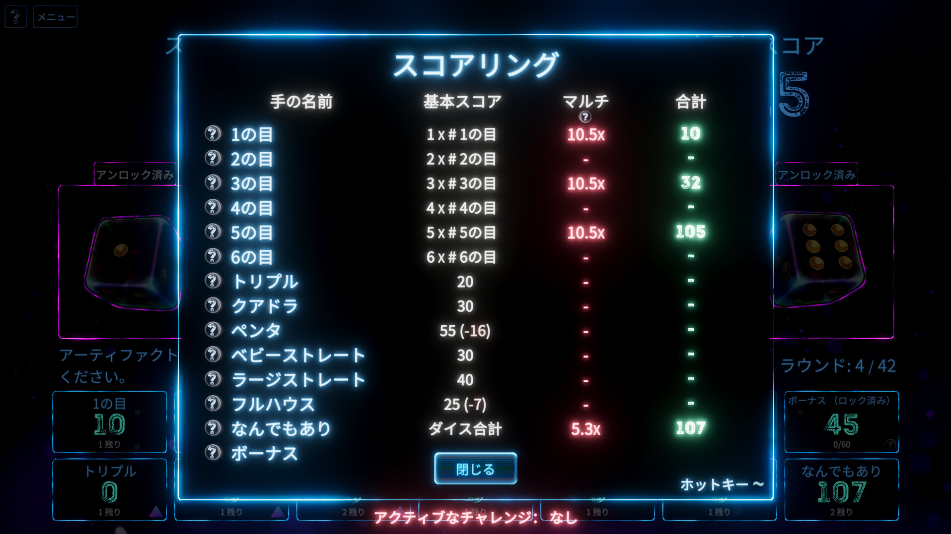 • チャレンジモード: さらなる難易度を求める人のために、18種類のチャレンジモードが用意されています。これらのモードではユニークな条件や障害が設定されており、クリアすることで実績や新しいアーティファクトがアンロックされ、スキルを証明できます。例えば、「不安定なロック」モードでは、ロックされたダイスが再度振り直される可能性があり、予測不能な要素が追加されます。
