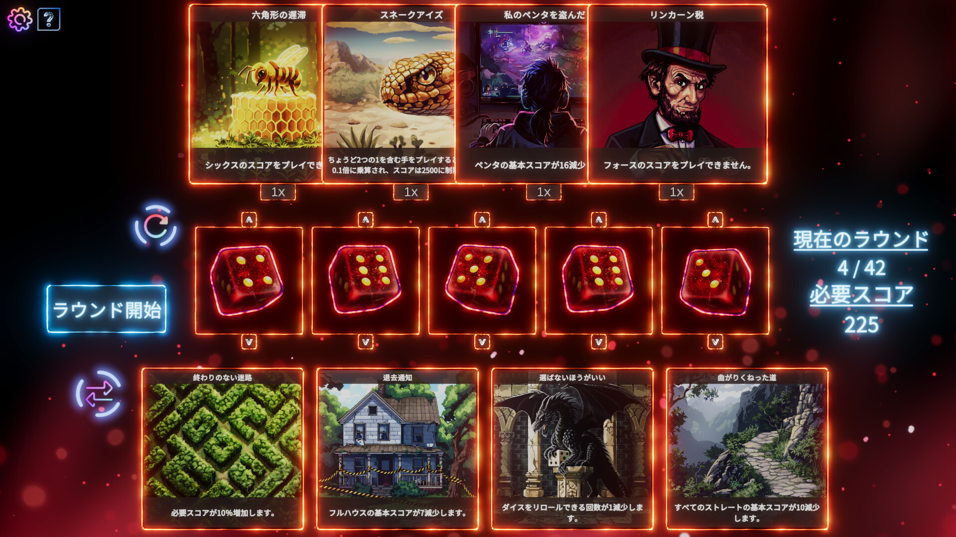 • エンドレスモード: 耐久力と戦略的スキルを試すエンドレスモードでは、可能な限り高いラウンドを目指します。スコア要件が次第に増加する中、どこまで運を押し進められるでしょうか?