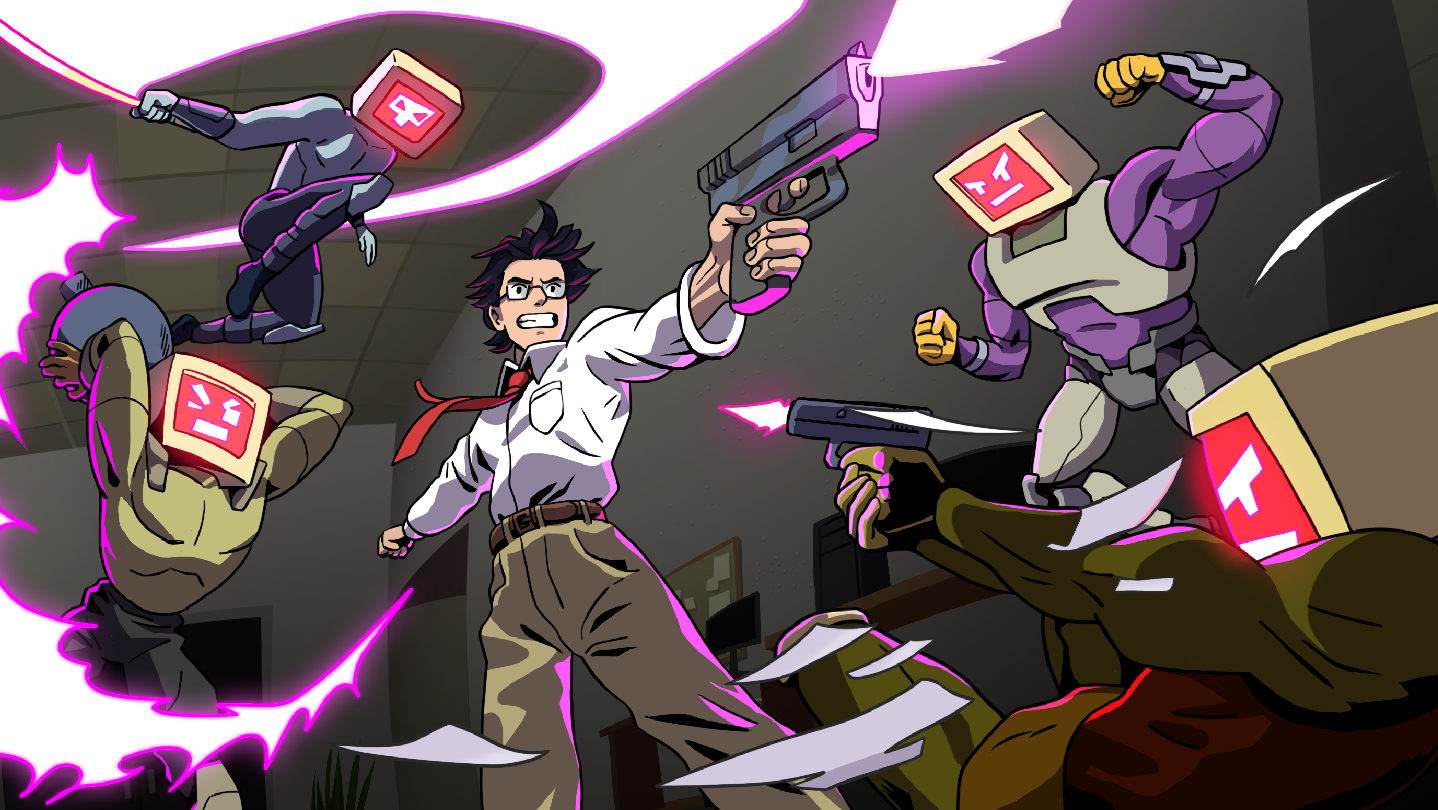 You choose your hero, collect weapons and upgrades, and face off against robotic enemies that have taken over the company you work for. Every floor of the building brings a new challenge. You must survive waves of increasingly absurd enemies, confront bosses inspired by the worst clichés of the modern corporate world, and hold out until the end of the workday.