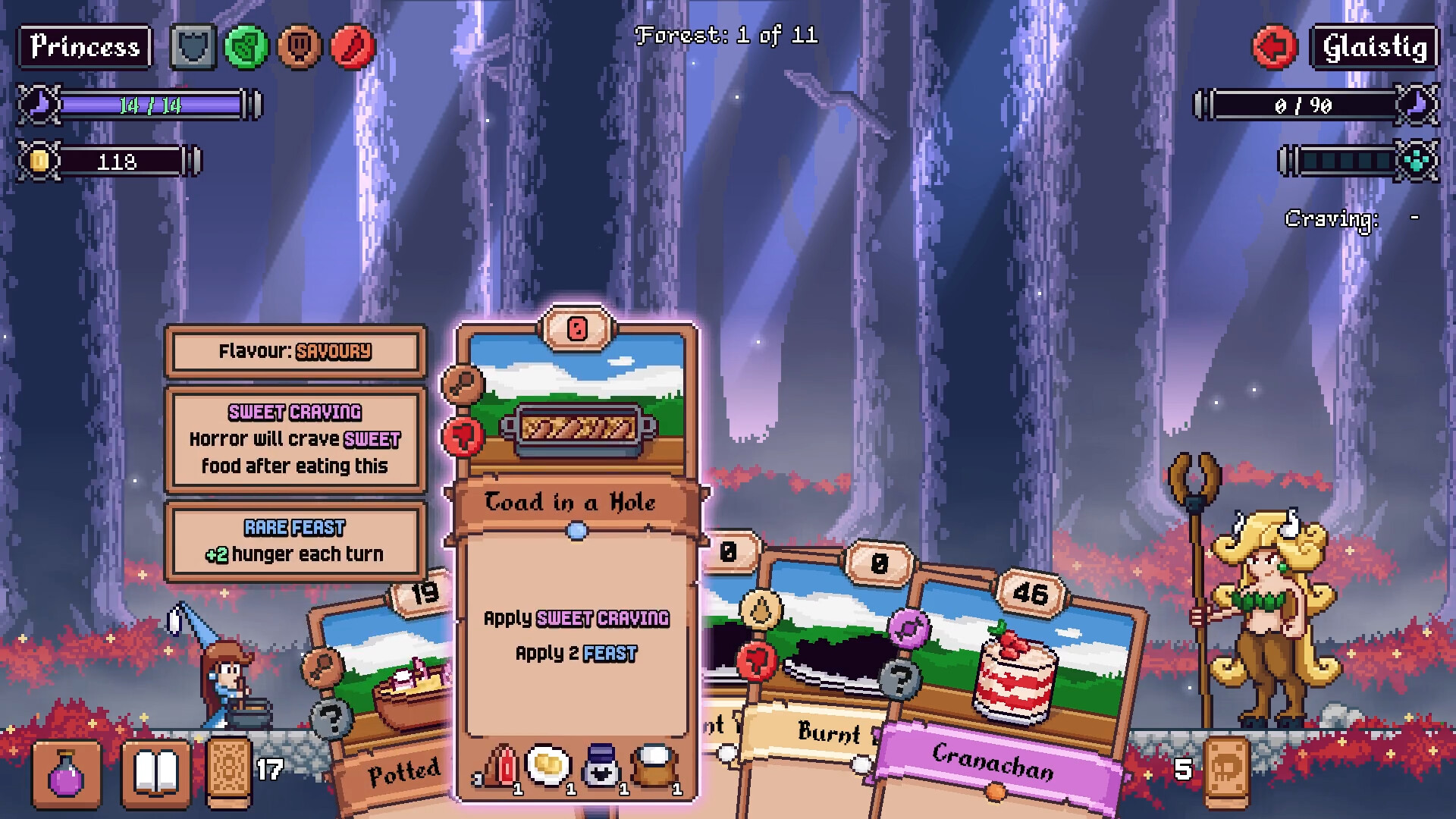 Embark on a culinary quest in Hungry Horrors, a roguelike deckbuilder where cooking replaces combat. As a brave princess, you will prepare dishes to feed legendary creatures from British and Irish folklore - and avoid becoming their next meal.