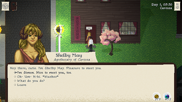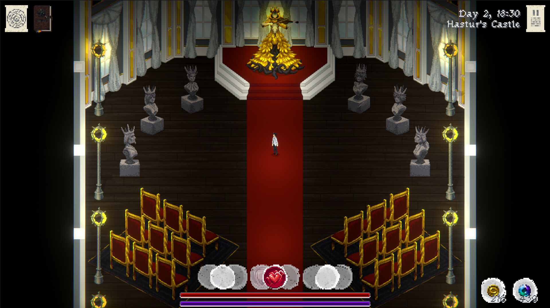 To gain the powers and equipment he needs, Simon seeks the assistance of Carcosian residents. Joining cults allows Simon to channel the power of that cult’s god through blessings, Guild commissions grant Simon a steady income, and by talking to various residents Simon finds shops at which he can purchase new equipment.