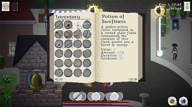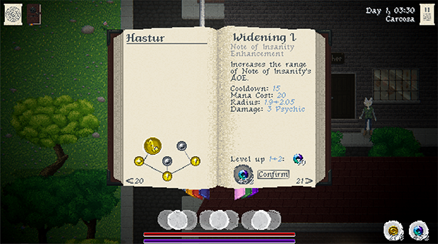 The Necronomicon is the summation of Simon’s inventory, blessing trees (skill trees), an index describing various people, places, and things Simon has encountered, and more.