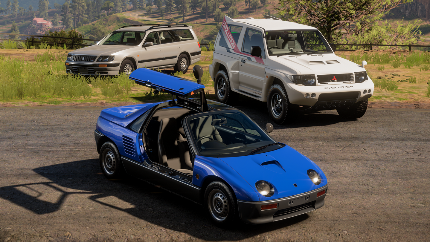 Japanese car culture and style will take over your garage with the JDM Jewels Car Pack. This Car Pack includes a versatile collection of cars such as the 1993 Autozam AZ-1, 1997 Mitsubishi Montero Evolution, 1997 Nissan Stagea RS Four, and the 1991 Toyota Sera