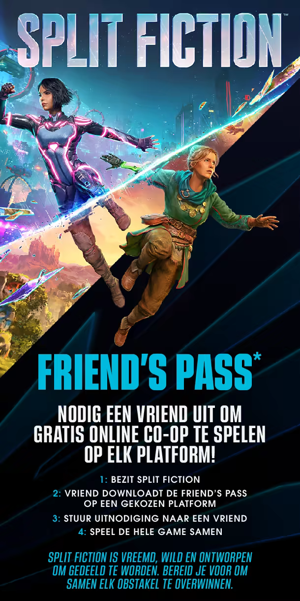 Nodig gratis een vriend uit met de Friend's Pass en beleef samen een adembenemend co-op avontuur terwijl jullie volledig worden meegezogen naar de vele werelden van Split Fiction.