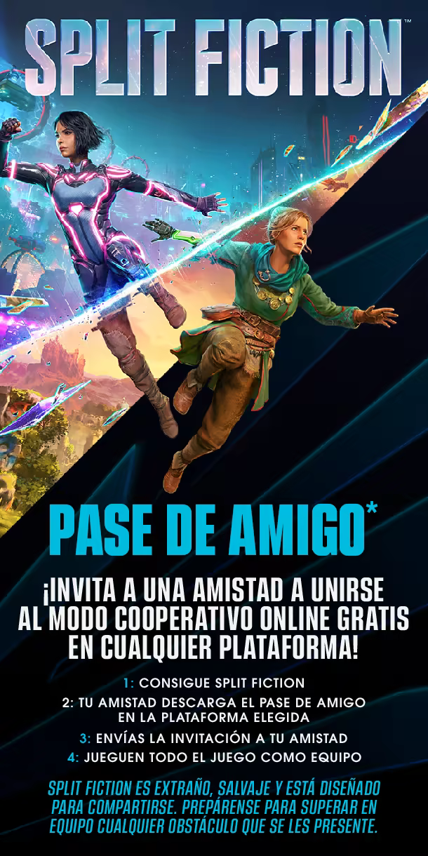 ¡Descarga el Pase de amigo* para jugar Split Fiction gratis con una amistad en cualquier plataforma! Prueba las primeras etapas del juego en cooperativo local o en línea multiplataforma con alguien que también tenga el Pase de amigo. Si tu amistad tiene el juego completo, puedes unírtele para jugar toda la aventura gratis.