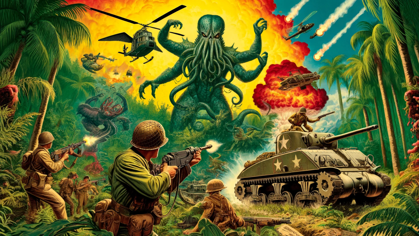 This game has a alternate history World War II diesel punk theme that shares likeness to historical people, places and items. However all associated likeness to real people, items and events is fictional and not historically accurate. Their are themes of war and battlefield scenarios where soldiers engage in gritty warfare. Depictions are not realistic of this violence and "Operation Tide", uses a pulp art style that does not glorify war violence. The video game in question strives to show adventure, the bonds of fraternity amongst soldiers and the enduring spirit of liberty in a stylized way. Whilst honoring the pulp magazine art style of the early to mid 20th century.