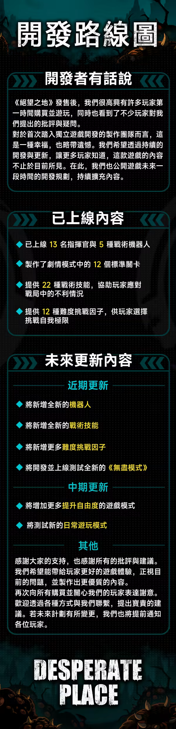 我們誠摯感謝《Thronefall》和《Into the Breach》這兩款遊戲帶來的設計靈感。我們希望能在這些優秀作品的精彩構想之上,加入我們自己的內容。也感謝所有熱愛策略遊戲的開發者與玩家,持續給予支持與熱情。