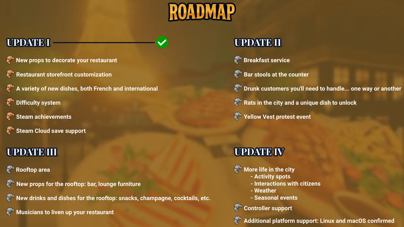 “The Early Access version is fully playable and already offers a solid simulation-management experience of running a Parisian brasserie. Players can interact with customers and contribute to their brasserie’s development: managing supplies, staff, and menu organization… For more details on upcoming features, check out our Roadmap.”