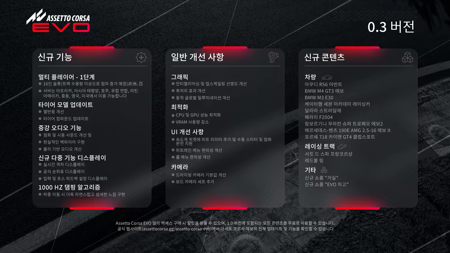 Assetto Corsa EVO의 0.3 얼리 액세스 출시를 통해 첫 멀티 플레이와 새로운 차량 9종 및 서킷 2종, 최신 타이어 모델이 추가되고, 성능과 그래픽, 게임플레이 및 UI 개선이 이루어집니다.