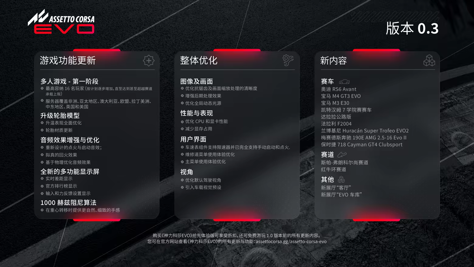 《神力科莎 EVO》0.3 抢先体验版迎来了首次多人游戏更新。新增 9 辆赛车,两条赛道以及全新的轮胎模型,并改善了性能、画面、游戏体验以及 UI 界面。