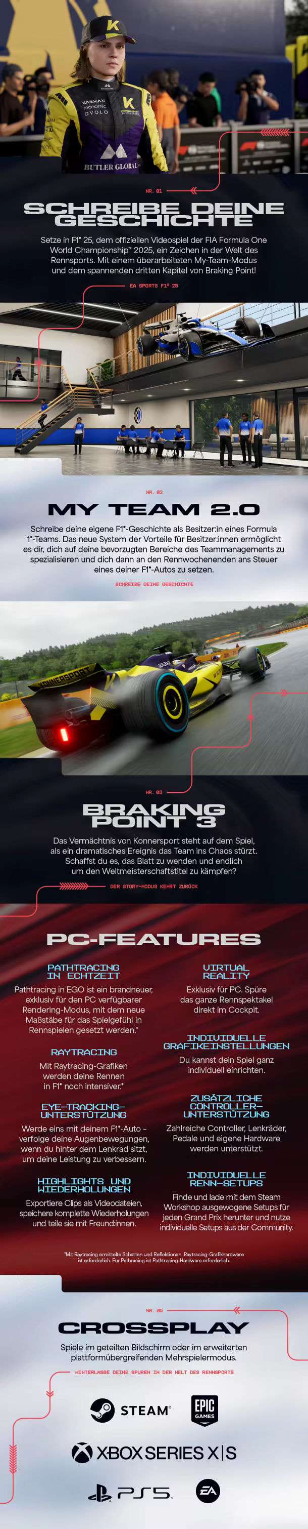 Setze in F1® 25, dem offiziellen Videospiel der FIA Formula One World Championship™ 2025, ein Zeichen in der Welt des Rennsports. Mit einem überarbeiteten My-Team-Modus, dem spannenden dritten Kapitel von Braking Point und mehr!