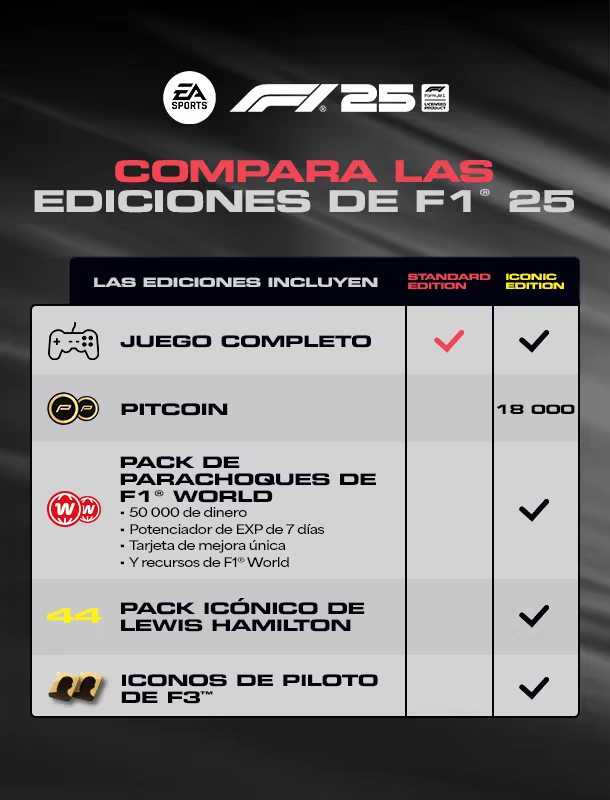 • Nuevos eventos cooperativos en línea: Un modo multijugador totalmente nuevo en F1® World en el que tú y tus amistades competís en equipo contra pilotos de la IA.