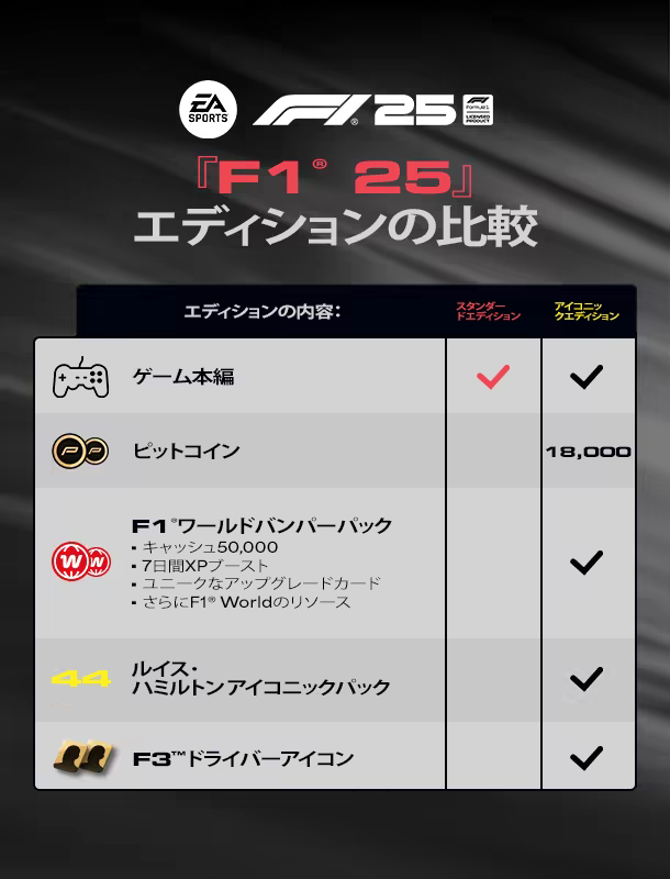 F1® 25 アイコニックエディションを購入すると、以下のものが入手できます:
