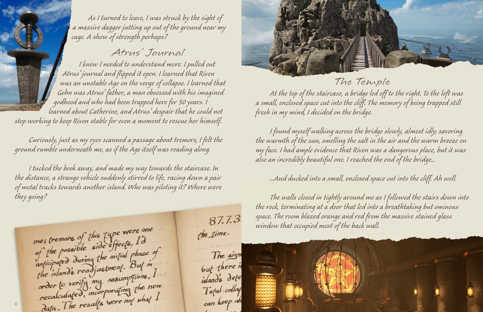 The Riven Journal contains many observations that hint at the deeper, never-before-revealed story of Riven, written from the perspective of a newcomer to the Age, just as perplexed by their discoveries as you may be.