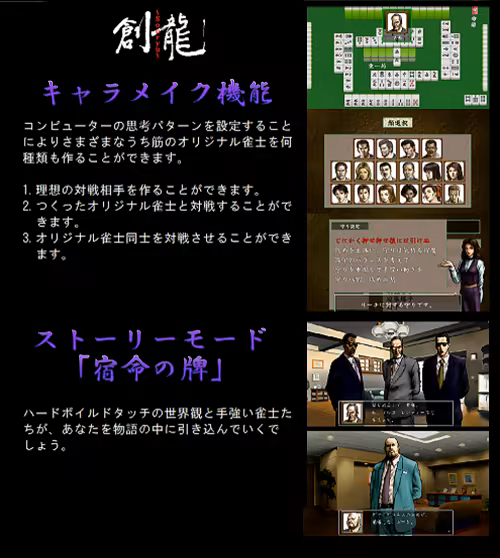 「キャラメイク」機能でオリジナル雀士と対戦ができる麻雀ゲーム。 ストーリーモード「宿命の牌」ではハードボイルドの世界観と手強い雀士たちがあなたを物語の中に引き込んでいくでしょう。