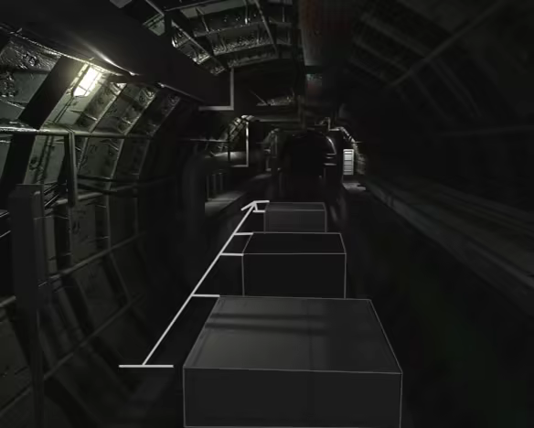 The developed simulator is based on a modern 3D- engine. It is therefor possible to calculate and use real time lighting in the tunnel systems by using the numerous lights available.