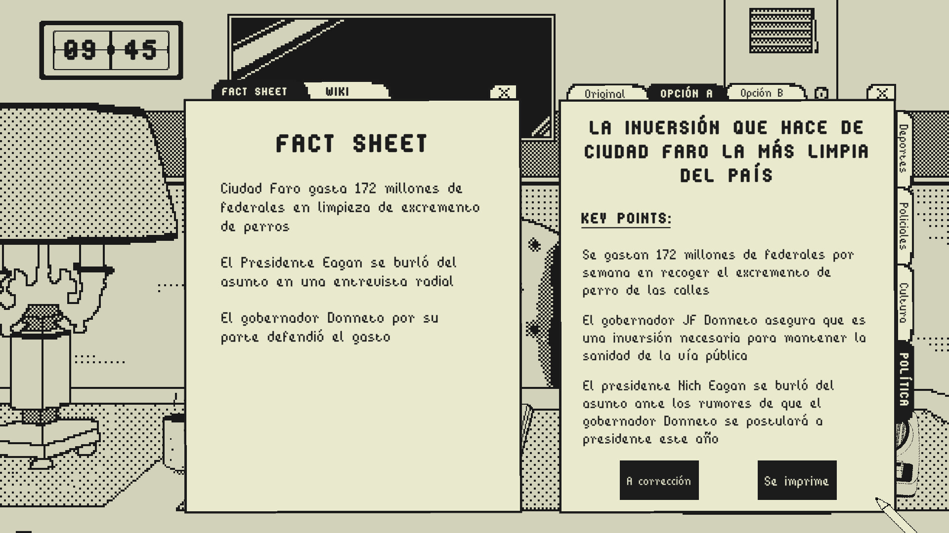 Fuiste elegido como editor en jefe para hacer crecer a este periódico, pero tus redactores son un desastre. Corregí sus borradores, elegí el tono de las noticias, hacé crecer la audiencia; y formá una relación con los políticos controversiales que te empujan a darles buena prensa en un año electoral