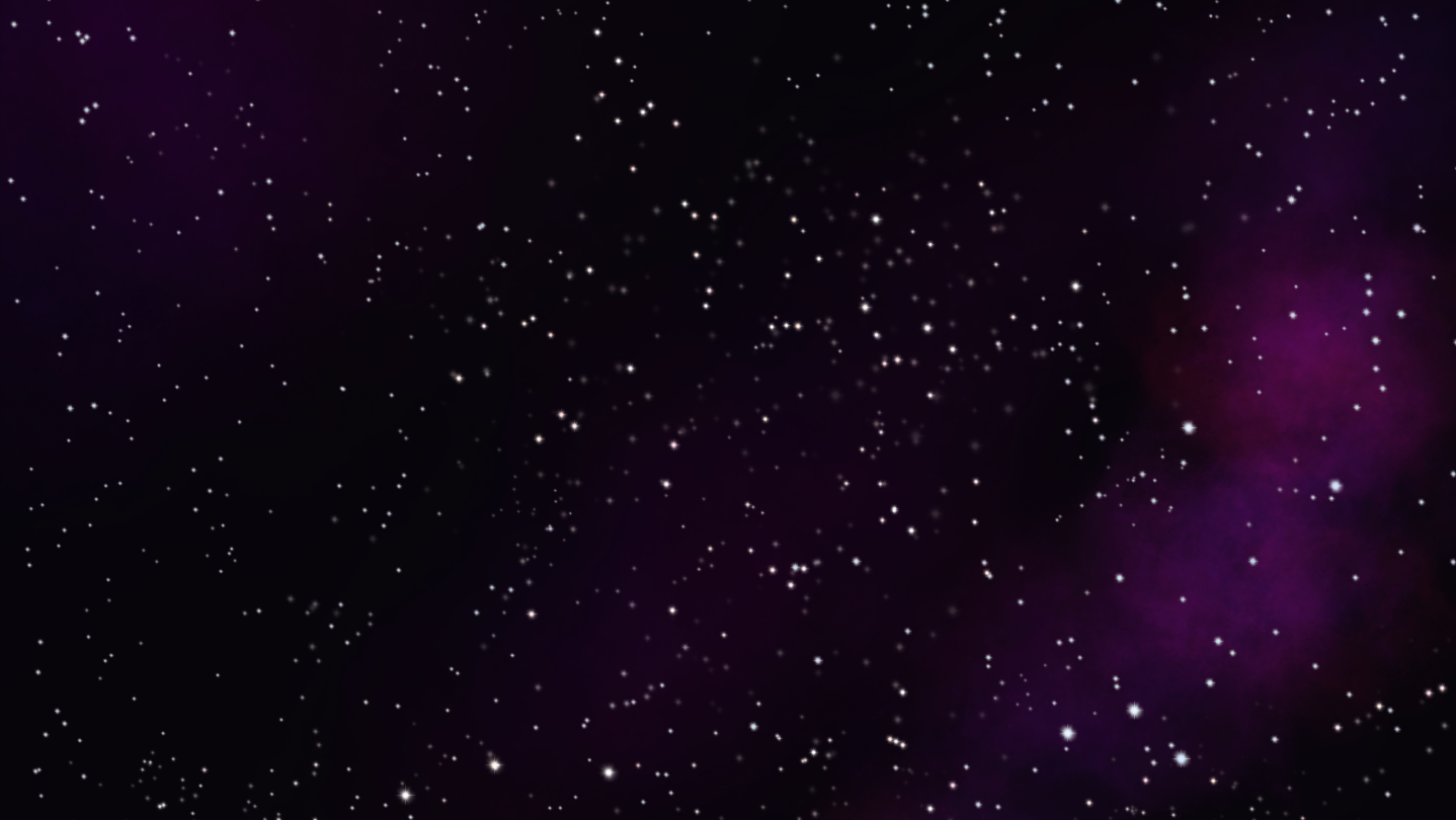 A purple robot stands on a dark moon. The sky overhead fades from black on the left, through reds and purples to a starry light blue on the right. An enormous planet with a glowing plasma surface is visible covering most of the right side of the sky. Rotund creatures with pointy faces are on the moon; they vary in color from pink to blue, and have different sets of features including horns, patches of leaves, and wings.