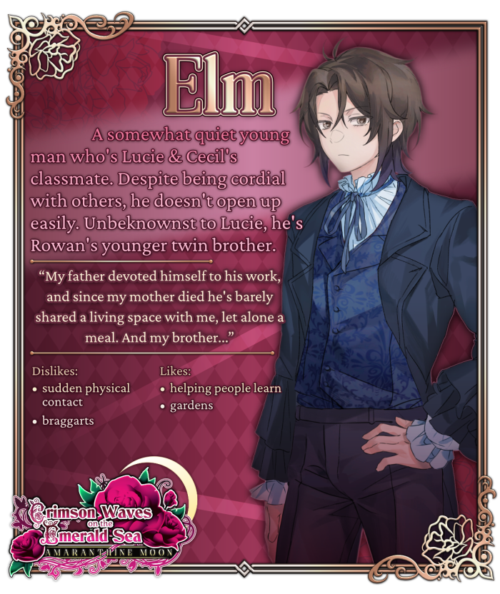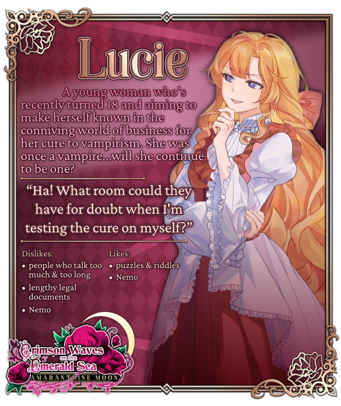 Crimson Waves on the Emerald Sea: Amaranthine Moon is the otome standalone sequel to Crimson Waves on the Emerald Sea, a Victorian vampire visual novel previously released in 2021. This visual novel is set around 5-6 years after the events of the first visual novel, following Lucie as the main character now that she's an adult.