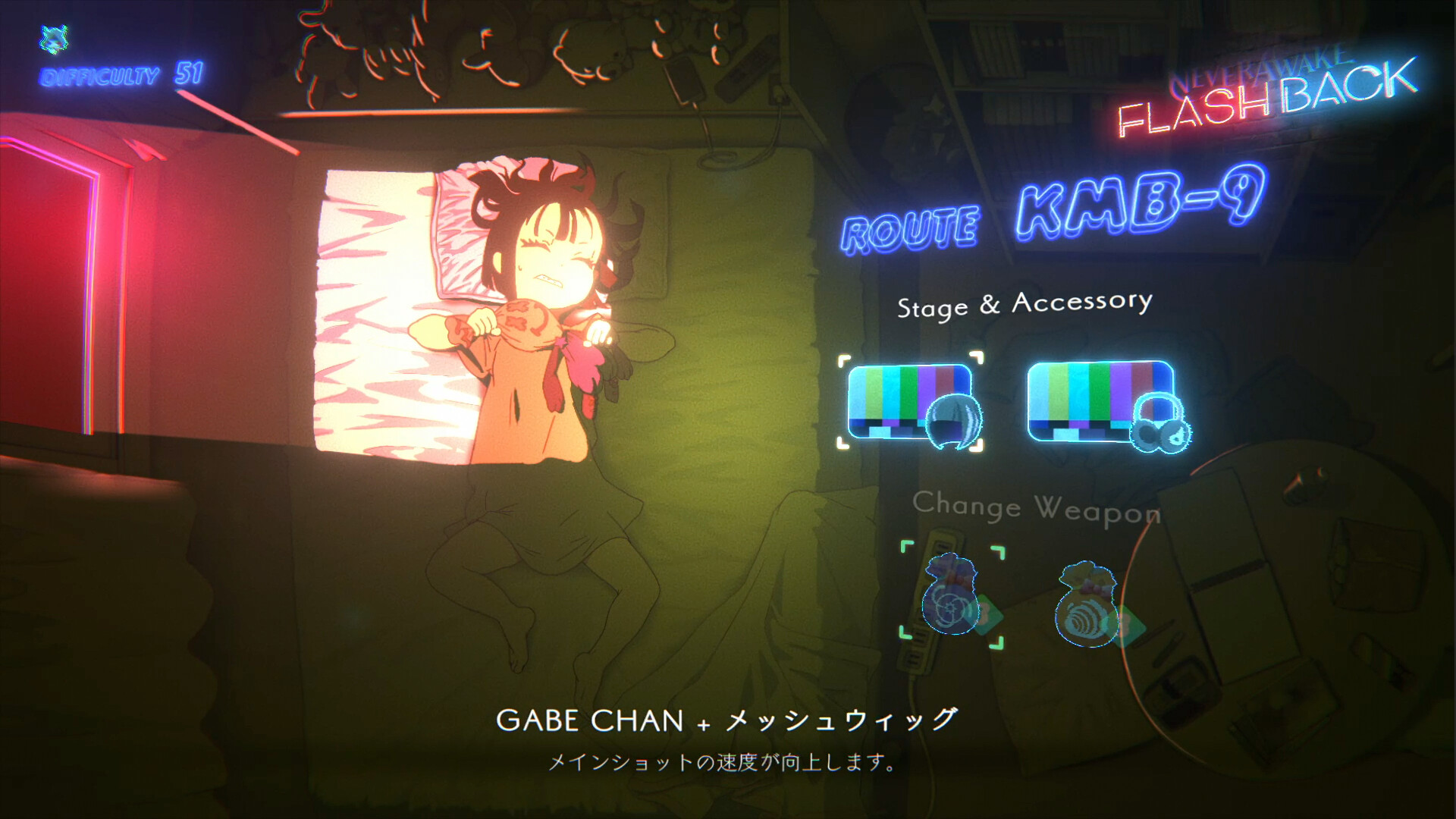 The basic specifications of “NeverAwake” have been retained, but the style of the game is more like an arcade shooter, where players progress through shuffled stages in a random order, selecting weapons and accessories available between each stage, providing a challenge in a short time.