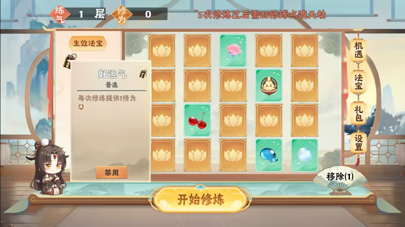 • 修炼系统:玩家可以在不同的修炼场景中进行修炼,每次修炼都会随机获得机遇卡,每次渡劫成功都会奖励法宝。随着修为的提升,玩家可以解锁更多的游戏内容和功能,比如:点亮各种法宝、灵宠系统,角色系统。这会让玩家变得更加强大。