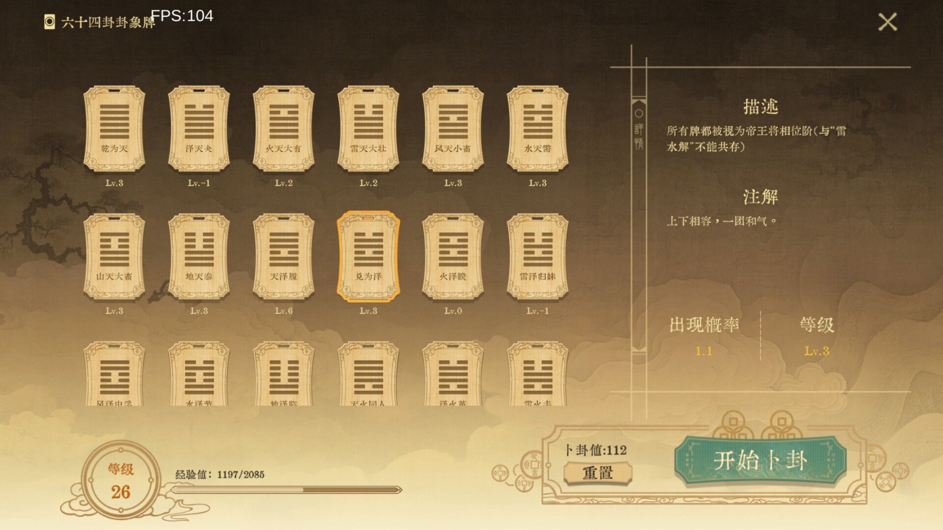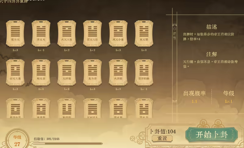 3、局外升级系统(构筑您的卡牌组合):玩家点击【收藏】进入【六十四卦象】页面,利用卜卦值【开始卜卦】,可获得新的卦象牌,并且能选择对这张卦象牌进行升级和降级,会影响这张卦象牌在商店出现的概率(开局会赠送10个卜卦值,玩家每次升级会获得卜卦值);